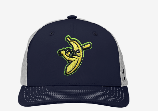 This structured trucker Savannah Bananas Dakota hat by Zephyr features an embroidered batting Banana logo on the front.