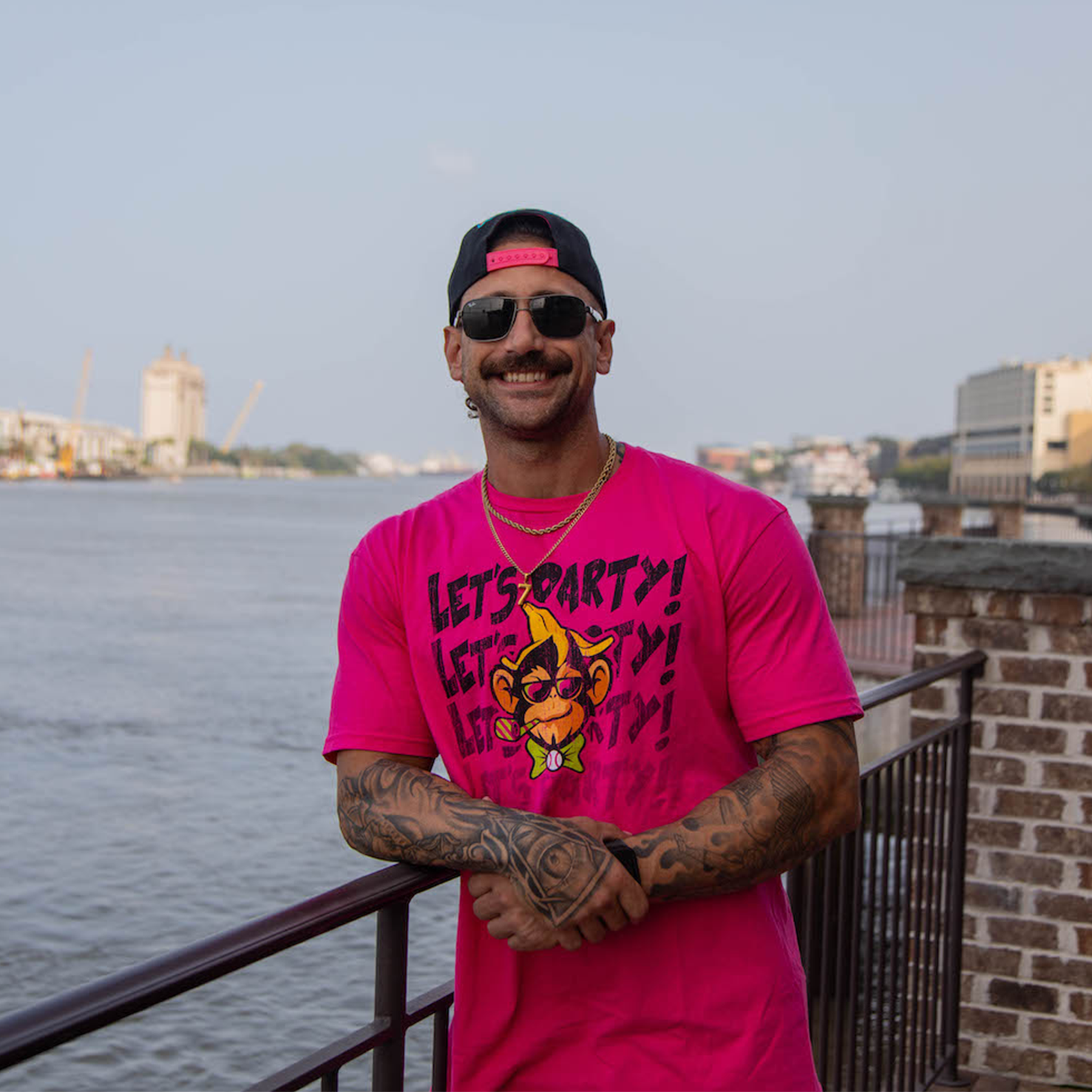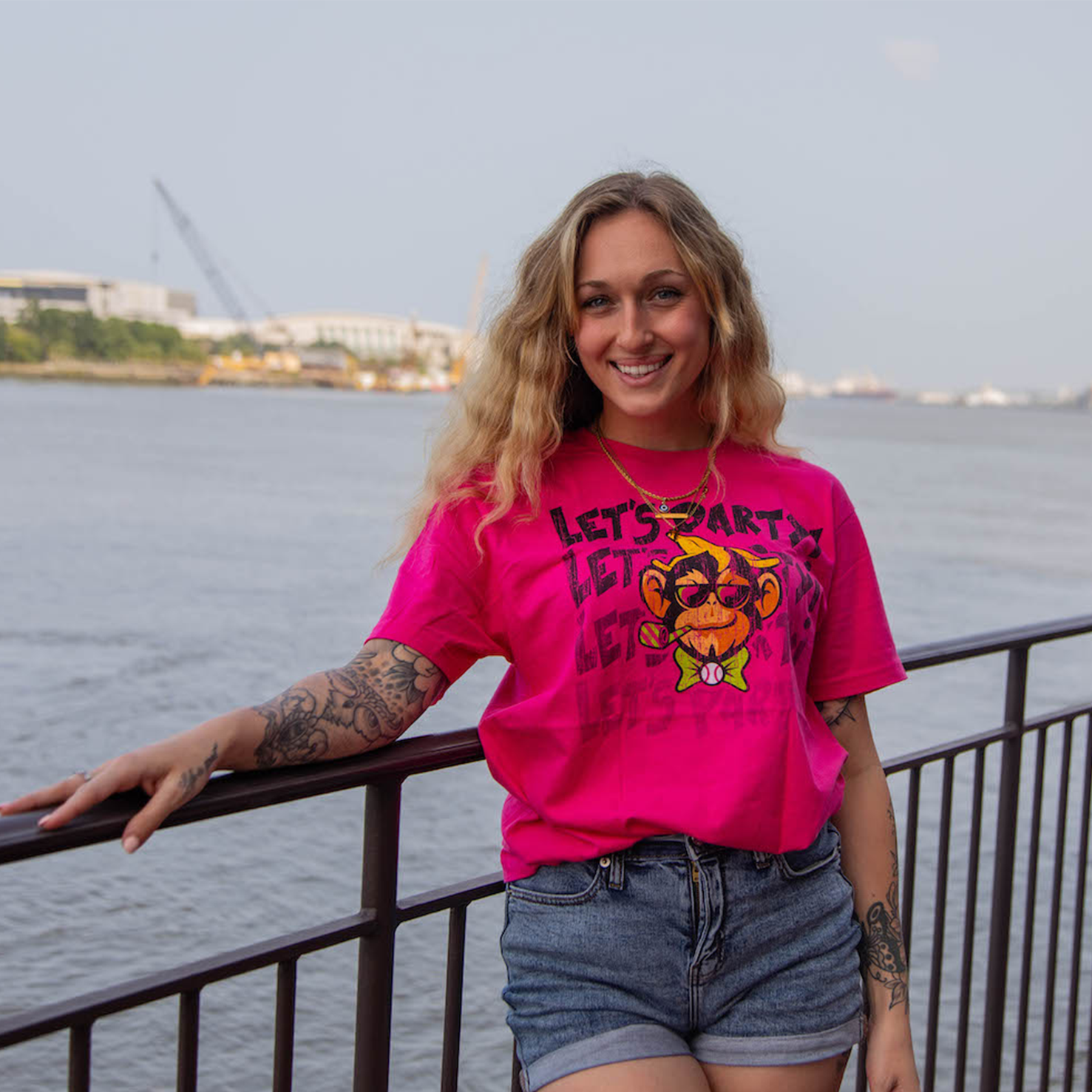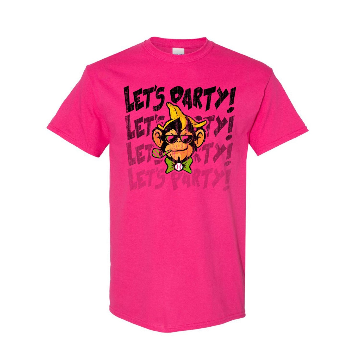 Introducing the ultimate party animal t-shirt that's sure to turn heads! The vibrant hot pink color and the repeating "Let's Party" design that cascades down the front screams "I'm here to have a good time!"