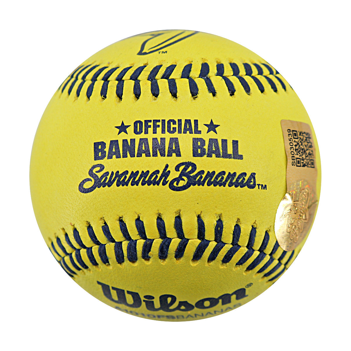 The items includes a Savannah Bananas QR coded numbered hologram. Authentication can be verified by its numbered hologram at CollectibleXchange.com or by scanning the QR code.