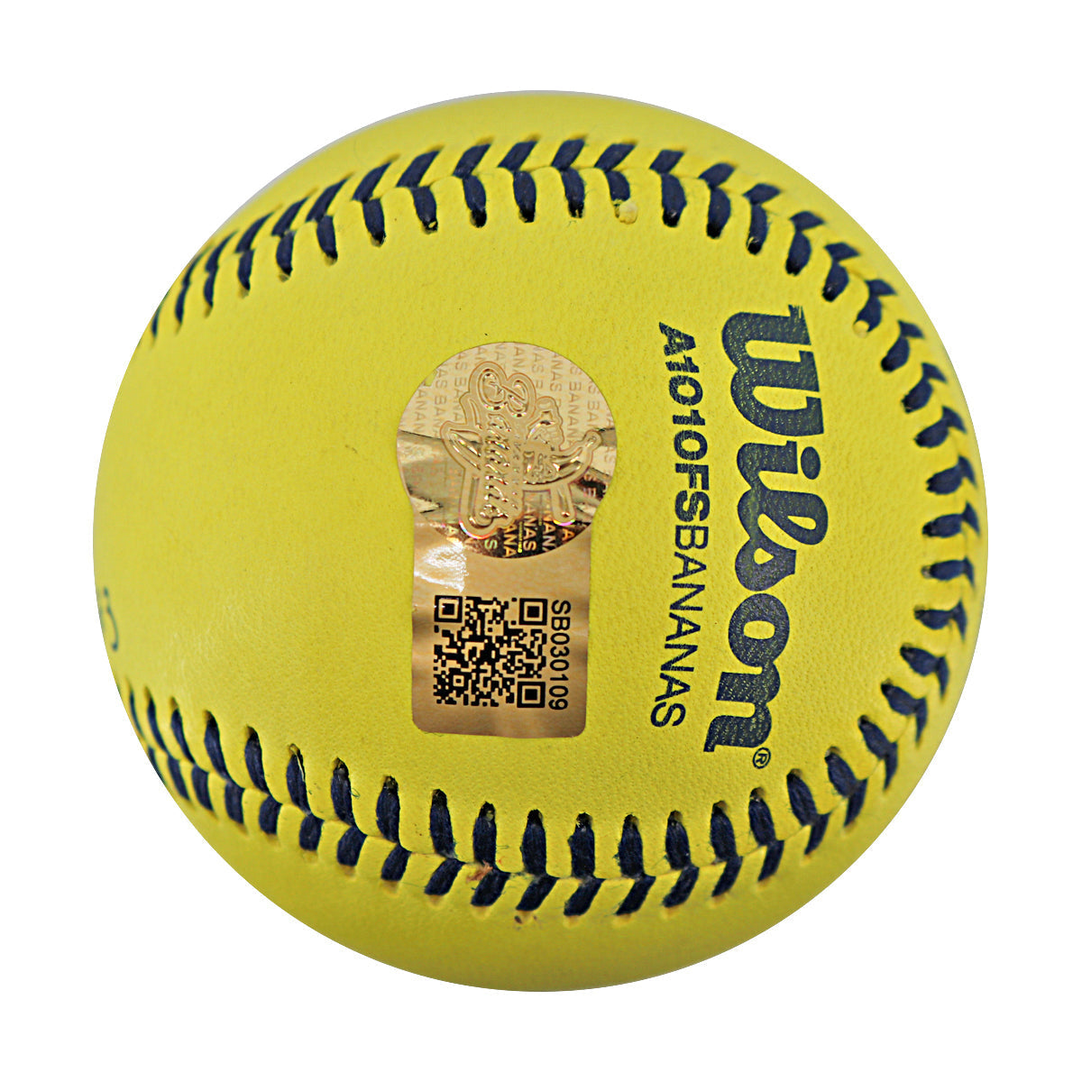 This game used Banana Ball was signed and inscribed by Val Perez on May 24, 2025, at Kauffman Stadium. Item includes a Savannah Bananas QR coded numbered hologram. Authentication can be verified by its numbered hologram at CollectibleXchange.com or by scanning the QR code.